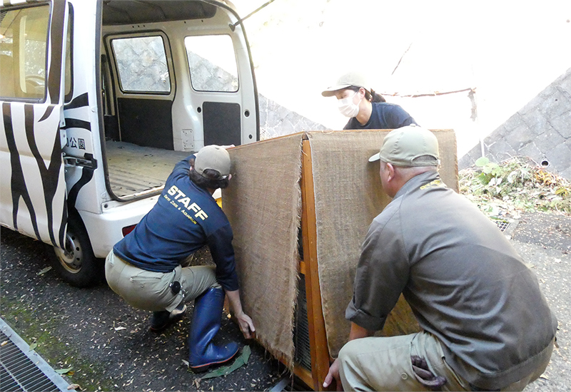多摩から金沢動物園は車で2時間ほどの距離で、飼育担当者が運搬をおこないました。展示場から箱に入れた直後は止まり木の上のほうにつかまりびっくりした表情で固まっていましたが、道中でときどき「ガサゴソ」という音がすることがあり、中を確認すると少しずつ下に降りて枝に座って落ち着いていました。