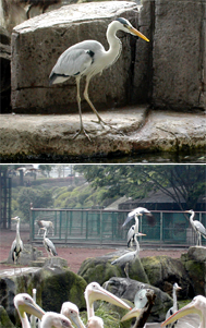 ペリカン池には、モモイロペリカンとコシベニペリカンがくらしています。しかし、ここにはもう一種類、鳥がやってきます。それは、アオサギです。