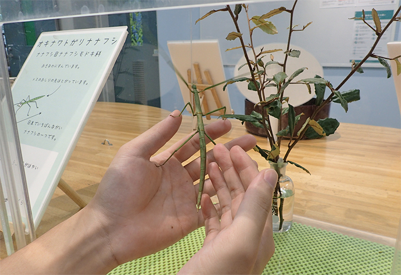 | 再開した虫とふれあいコーナー | オキナワトガリナナフシとのふれあい |