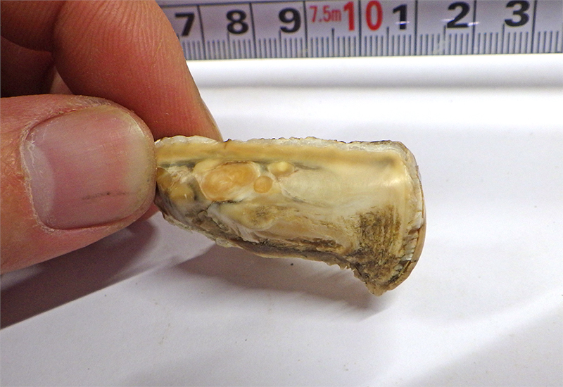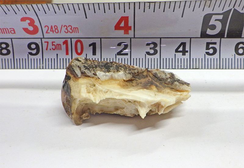 アフリカゾウの運動場で見つかる白くて硬い塊といえば、オスの「砥夢」(トム)の牙の欠片か、カラスが運んできたライオン用の牛骨の破片である場合がほとんどです。「牙だったら嫌だなぁ」と思いながら拾い上げてみると、牙でも牛骨でもありませんでした。歯の可能性もあったので砥夢の口の中を確認したところ、歯の一部が欠落したと思われる部分がありました。