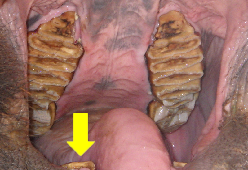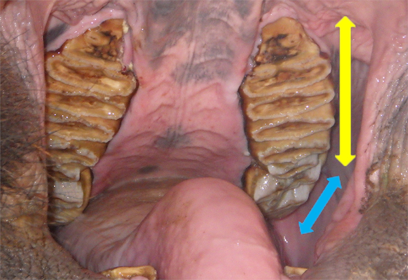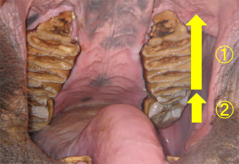 砥夢の口内。2本の矢印の範囲が、上あご左の後臼歯です。