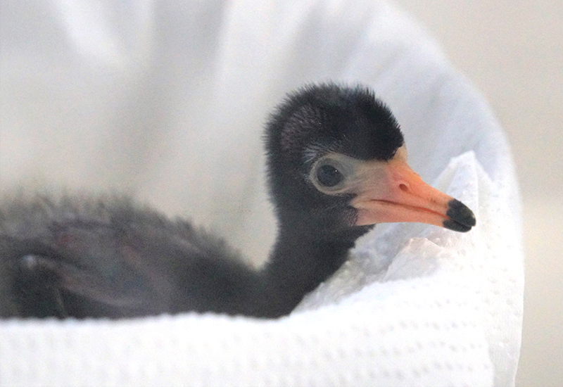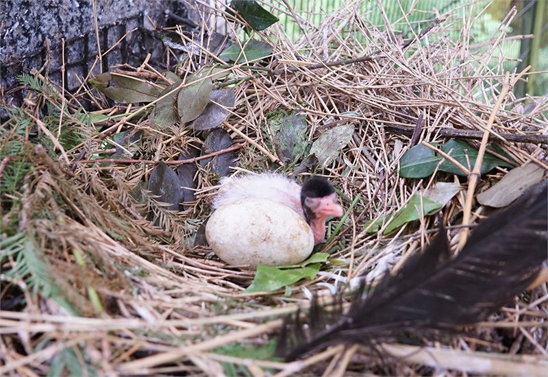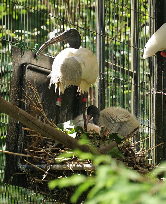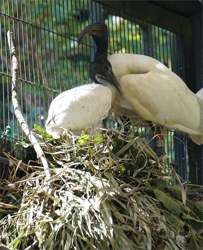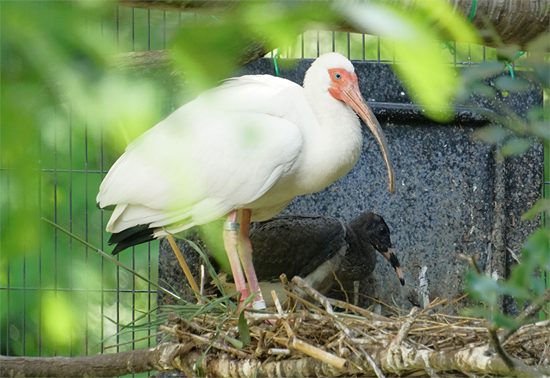 ここ数年、シロトキが繁殖せず、産卵を促すとともに落ち着いて抱卵できるように、園内のウォークインバードケージから繁殖力の強いクロトキを2ペア移動していっしょに飼育しました。落ち着いたペアのクロトキの繁殖行動からシロトキは安心して営巣や抱卵できたためか、今期はすでに6羽のひなが巣立ちました。そのうち人工孵化させた卵は1つで、ほかはすべて自然孵化しています。人工孵化したひなも、孵化後6日目まで人工育雛してから擬卵を抱いている巣に戻したところ、仮親となるシロトキがそのひなを受け入れて育雛をしてくれました。