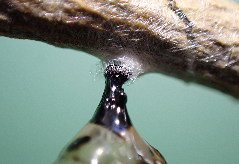 蛹の軸は付着直後にも関わらず、ブンブン振られても落ちません。どんな接着面なのかと、羽化後に拡大写真を撮ってみると、マジックテープのようなフックで糸座の糸に絡まっていました。最後のブンブンでフックをしっかりと糸座にひっかけていたのかもしれません。
