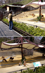 とはいえ、植栽の高さはわずか60センチ、幅は1メートル。カンガルーなら飛びこえてしまいます。そこで、放飼場前の観覧スペースを取り囲むように、園路の後ろ側には柵を立ち上げ、扉を左右2か所にとりつけました。