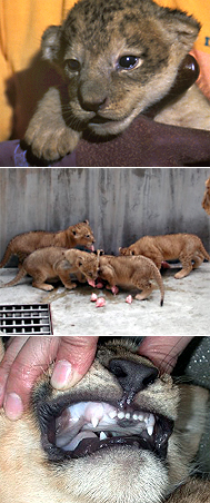 2003年8月21日に生まれたライオンの赤ちゃん4頭。犬歯も生えてきました! おとなが食べているえさにも興味シンシンです。お母さん用のえさを横から食べようとする子も。