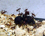 アリは巣に持ちこんだ葉をこまかくかみくだいて、菌類を育てる「栽培床」をつくります。ここに生える菌類が、アリの食糧になるのです。