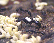 一般にアリの女王は働きアリよりも体が大きく、簡単に見わけることができますが、キバハリアリの場合、女王と働きアリの大きさはそれほど違いがありません。そこで、展示している女王の背中には白いプラスチック片を貼りつけました。