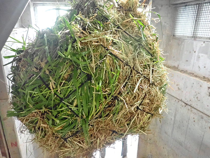 乾草と青草を混ぜてヘイネットに入れた状態がこちらです。