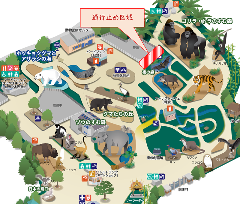 上野動物園東園のバードハウス解体工事に伴い、バードハウス横からゴリラ・トラのすむ森へ抜ける園路につ来まして、12月9日(火)から12月19日(金)までの期間、終日通行止めといたします。
