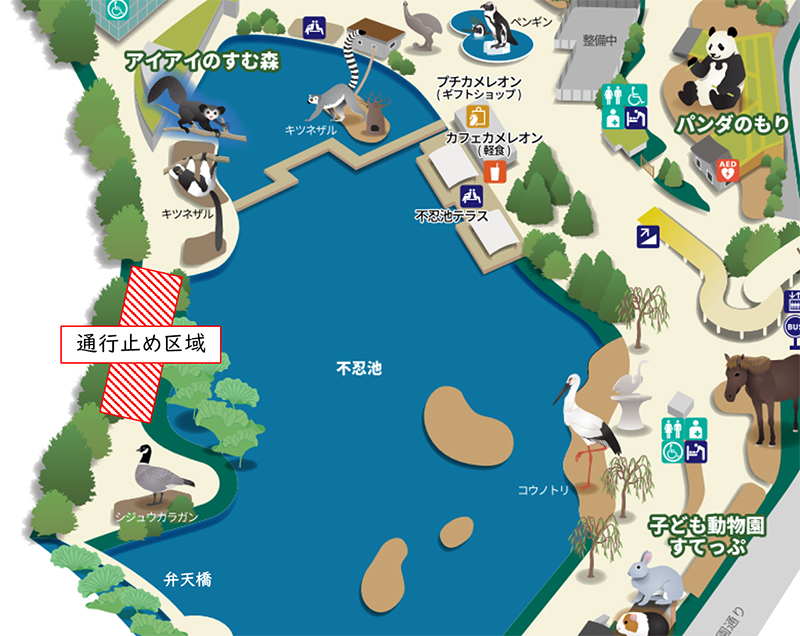 園路補修工事のため、アイアイのすむ森エリアと弁天橋を結ぶ不忍池沿いの園路の一部を、2025年10月28日(火)から11月9日(日)までの期間終日通行止めといたします。