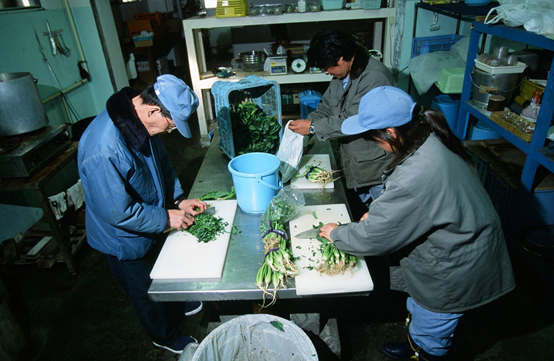 2014年から使われている新飼料室はワンフロアで、調理室、事務室、冷蔵庫、冷凍庫、ペレット倉庫があります。並んでいる機材は更新されましたが、動物に合わせて切ったり加熱調理したりしているのは以前と同じです。ただ、比較的新しい動物舎には専用の調理スペースが備え付けられているので、多くの飼育係は飼料室で肉や野菜を受け取り、それぞれの動物舎に持ち帰ってから切っています。