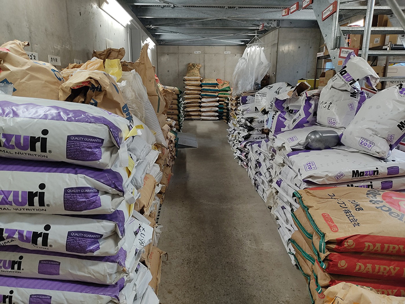 これだけの量が毎日のように届けられるので、飼料室には常に5~6tの飼料が保管されています。災害時の食料備蓄としてローリングストックという考え方がありますが、当園でも野菜、果物、魚、肉などの一部を冷蔵庫、冷凍庫に常時ストックするほか、倉庫のペレットや乾草も余裕を見て備蓄するようにしており、大地震などの災害に備えています。