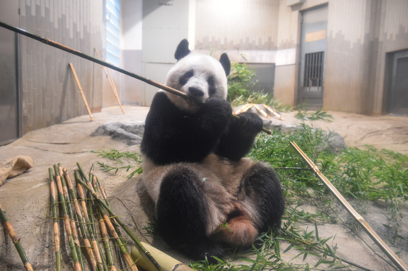 えさは、モウソウチク、シノダケ、マダケなどのタケを中心に、パンダ団子、ペレット(固形飼料)、ニンジン、リンゴなどをそれぞれ必要に応じて与えています。9月22日以降、気温が下がった日には、屋外の運動場ですごす時間を設けています。