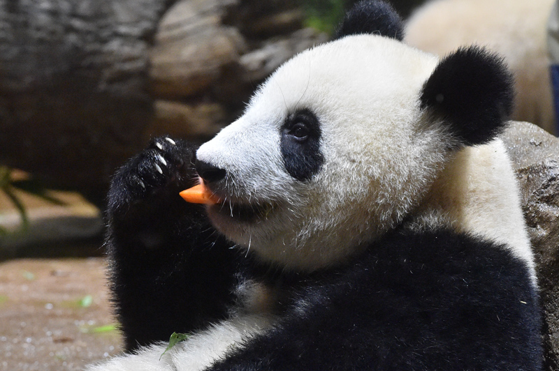 えさとしてモウソウチク、シノダケ、マダケなどのタケを中心に与えており、副食であるパンダ団子、ニンジン、リンゴもよく食べています。給餌量は、シンシンの採食状況や体重の変化、子どもへの授乳に応じて適宜変更しています。