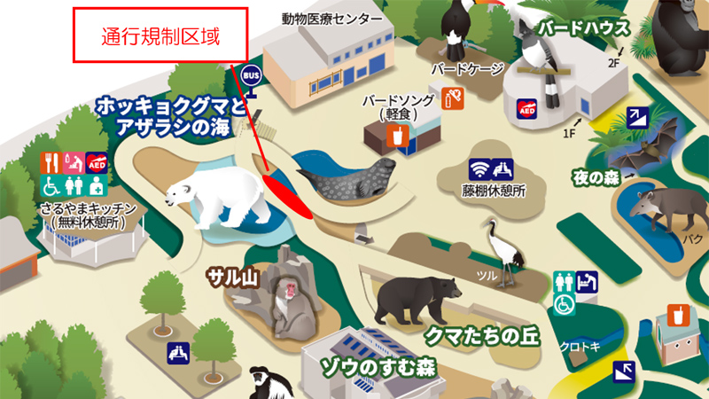 また、この工事にともない、ホッキョクグマ大放飼場前の通路を一部通行規制します。通路のアシカ・アザラシ側を最大幅1mほど規制しますので、譲り合ってご通行ください。
