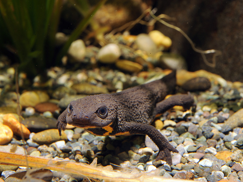 生息域内保全では、都立動物園・水族園4園が協力して都内ではあまり見られなくなったアカハライモリの生息地の保全に取り組んでいます。域内保全活動をしている都内の生息地で、生息個体数の調査や新たな産卵場所の造成、地元学校への教育普及活動をおこなっています。