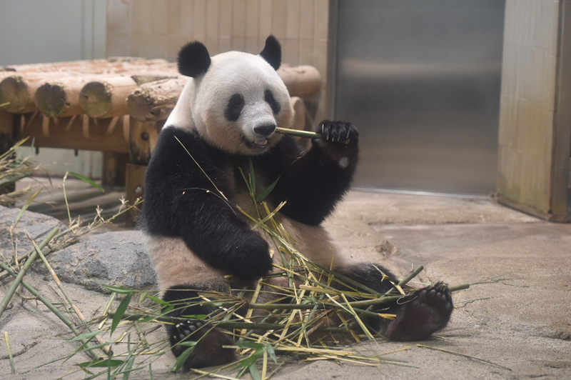 えさは、モウソウチク、シノダケ、マダケなどのタケ・ササ類を中心に、パンダ団子、ペレット(固形飼料)、ニンジン、リンゴなどをそれぞれ必要に応じて与えています。日によってトウチク、マダケなどのタケノコを与えており、よく食べています。