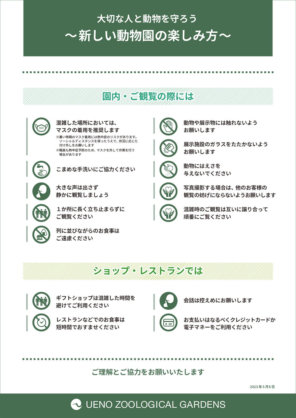 上野動物園では、新型コロナウイルス感染症の状況をふまえ、「新しい動物園の楽しみ方」を定めました。ご来園にあたっては、これらのルールを守ってくださいますようお願い申し上げます。