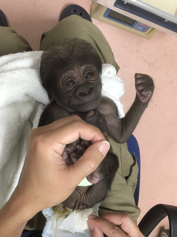 獣医師が子を抱き上げたとき、麻酔で眠っているモモコの乳首に子の口元を近づけると自力で吸い付き母乳を飲むことが確認できました。その後モモコから搾乳した母乳を哺乳瓶からも飲ませることもでき、子は元気そうでした。しかし、現在のモモコの状態では子を育てることができないと判断し、やむを得ず人工哺育に切り替えました。現在、子は保育器の中におり、安定しています。6月3日以降はなるべく群れとの接点を維持するよう気を配りながら、人工哺育をおこなっていく計画です。