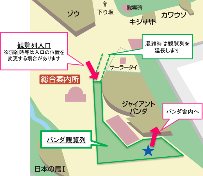 - ジャイアントパンダ舎の入口付近で、観覧列が前列と後列に分かれます(下図★印)。お好きな方へお進みください。