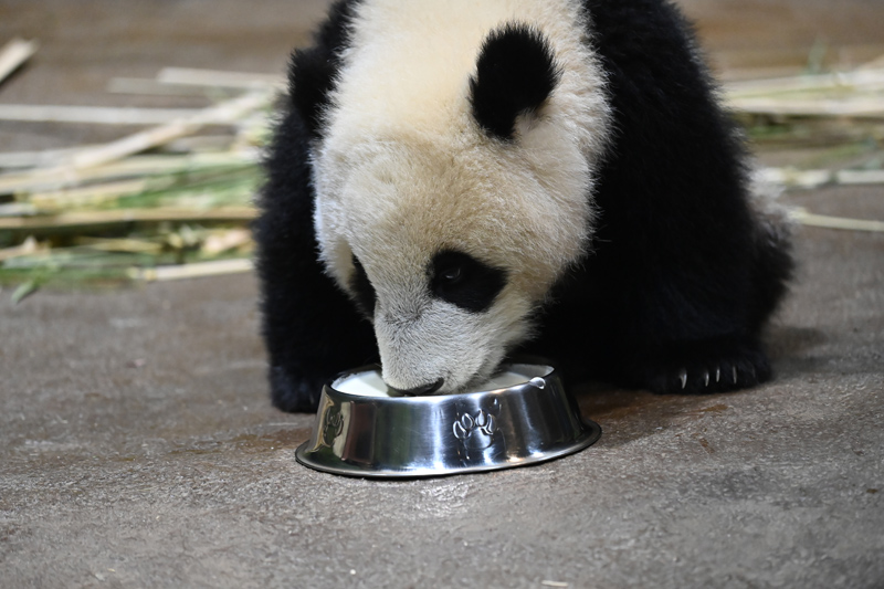 えさとしてモウソウチク、シノダケ、マダケなどのタケ・ササ類を中心に与えており、副食であるパンダ団子、ニンジン、リンゴもよく食べています。給餌量は、シンシンの採食状況や体重の変化、子どもへの授乳に応じて適宜変更しています。日によってモウソウチクのタケノコを与えており、よく食べています。