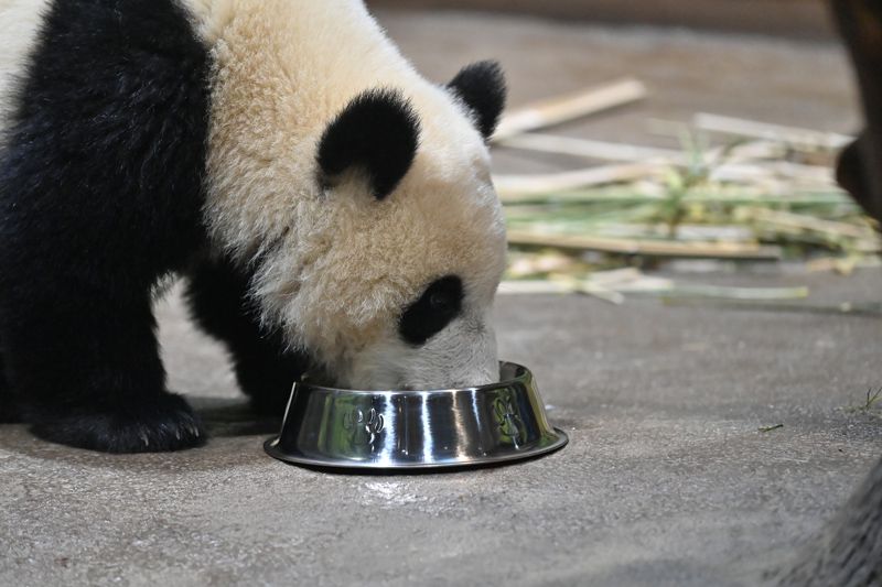 夜間はこれまでと同様に、シンシンにじゃれついたり、2頭でじゃれあったりするほか、タケやタケノコをかじる姿が見られています。フンを確認する限りでは、まだ固形物の採食はしていません。