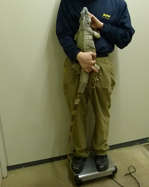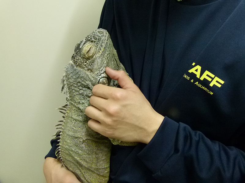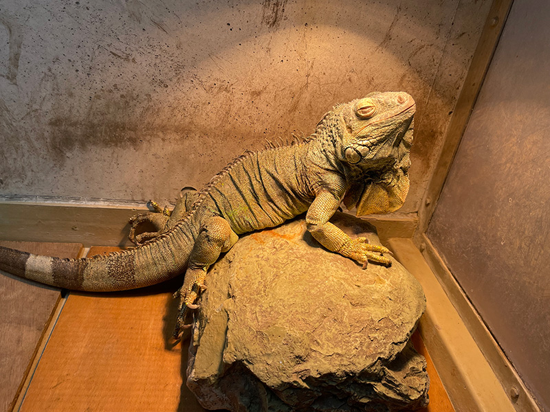 近年はずっとオスとメスの2頭を展示していましたが、この冬、メスの動きが緩慢になったり採食量が減ったりと体調の波が大きくなってきました。このメスは保護により来園した個体なので年齢は不明ですが、ここでの飼育歴は15年になります。グリーンイグアナの平均寿命は10~15年と言われています。高齢になったこのメスが今後もよりよいくらしができるよう展示からは引退させて、さまざまなケアをおこなうことにしました。