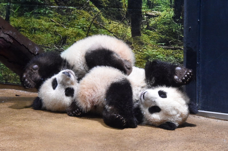 夜間はこれまでと同様に、シンシンにじゃれついたり、2頭でじゃれあったりするほか、タケをかじる姿が見られています。