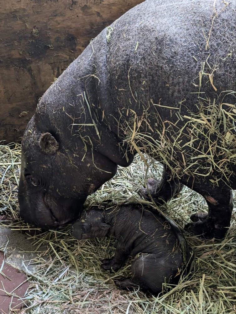 2024年8月下旬に繁殖のために2頭を同居させたところ、複数回の交尾が確認され、2025年2月17日の超音波検査で胎児と思われる影が見られたため、出産に備えて準備を進めてきました。3月14日の午前9時頃に出産がはじまり、9時25分に無事生まれたことを確認しました。上野動物園におけるコビトカバの子どもの誕生は、今回母親となったナツメが生まれた2011年6月以来13年ぶりです。