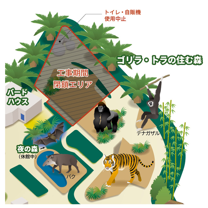 また、エリア内で隣接するトイレ、自動販売機が使用できなくなるほか、モニターでの室内のようすもご覧いただけなくなります。ご来園のみなさまにはご迷惑をおかけいたしますが、ご理解くださいますようお願いいたします。