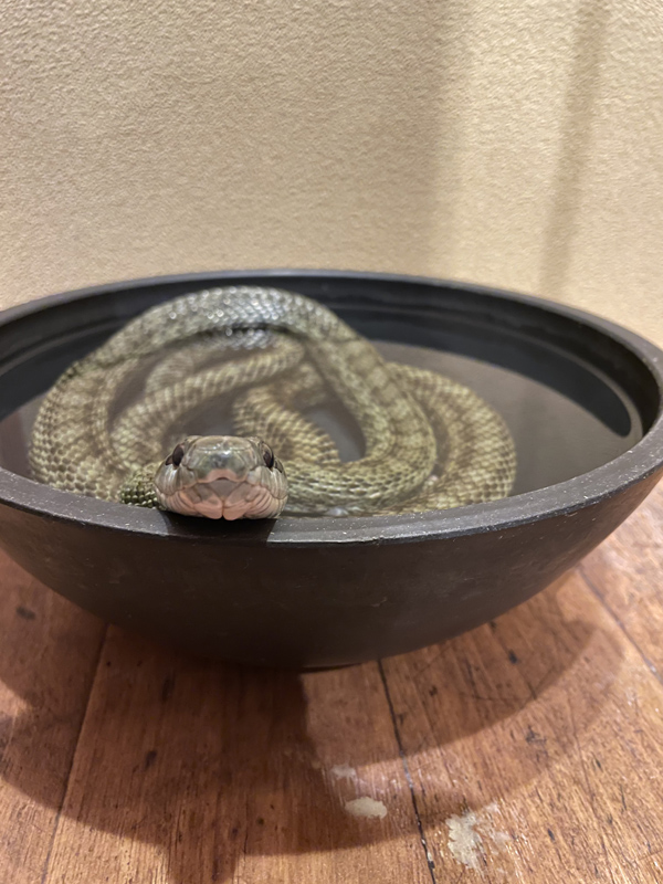 特設展示「民俗学からみる くらしの中の両生類・爬虫類──Folklore × Herpetology」のアオダイショウはすでに食欲が下降気味です。今後のようすしだいで、展示をお休みすることになるかもしれません。