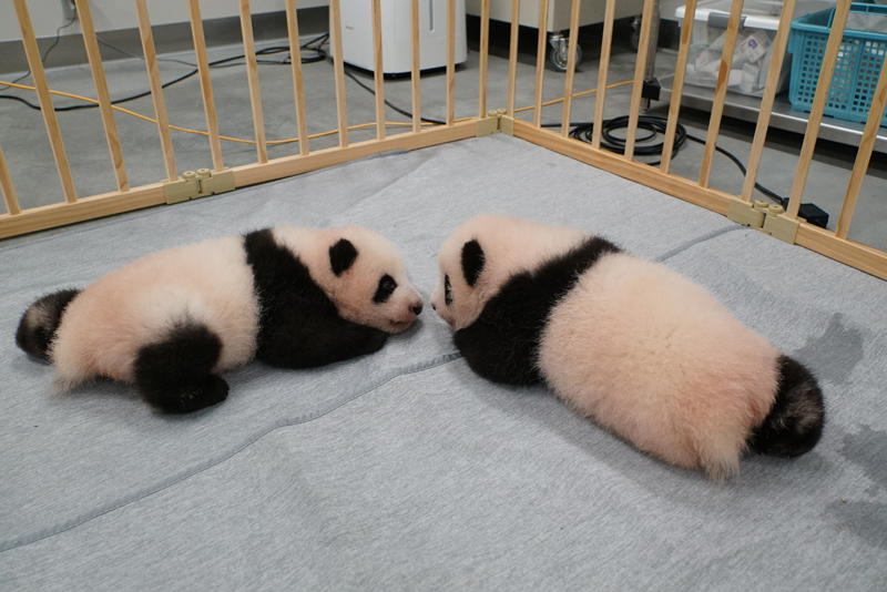 ジャイアントパンダの双子(左#1・オス、右#2・メス、89日齢)