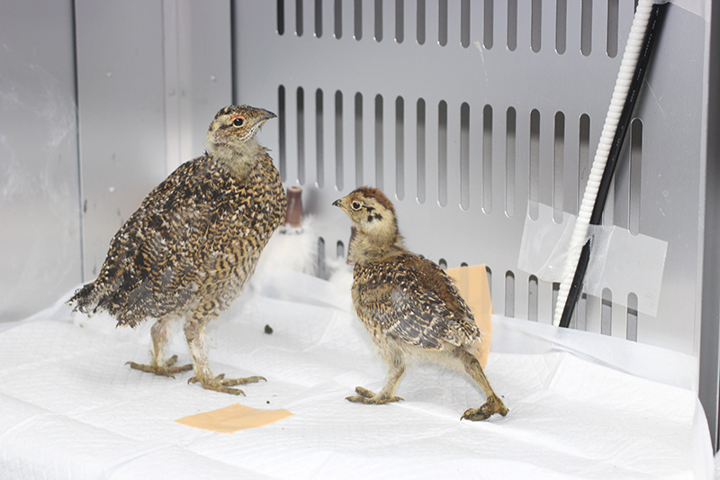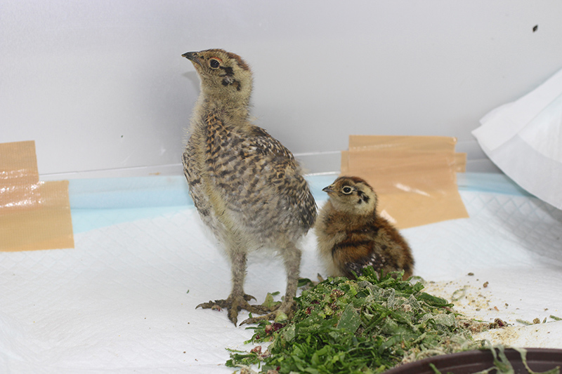 ニホンライチョウのひなは群れで育てた方が落ち着くので、15日間の差はありますが、2羽を同居させています。2羽目は1羽目のあとをついてまわり、えさの食べ方をまねしたり、おなかの下にもぐりこんだり、2羽で寄り添って眠る姿も観察されています。