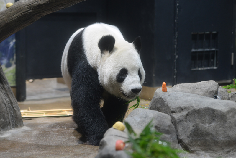 えさとしてモウソウチク、シノダケ、マダケなどのタケ・ササ類を中心に与えており、副食であるニンジン、パンダ団子、リンゴもよく食べています。