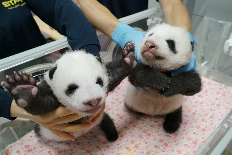 2頭は8月12日に50日齢を迎えます。直前の48日齢に実施した身体検査では2頭とも体重が2,000gを超えており、シャンシャンと比較しても問題ない成長だと考えています。