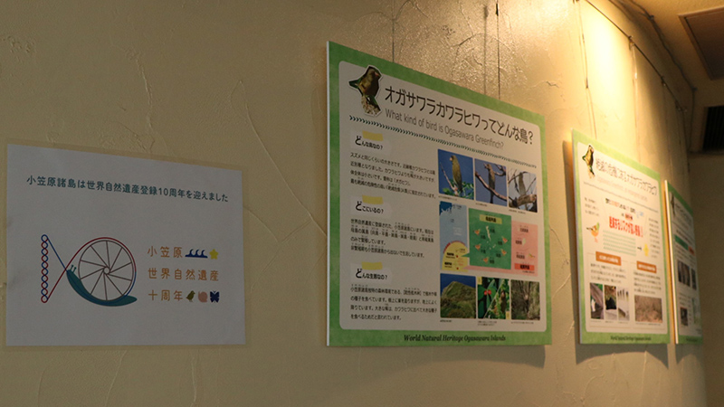 公益財団法人山階鳥類研究所が共同で制作した、絶滅危惧種オガサワラカワラヒワの保全・普及啓発を目的としたポスターを展示しました。当園の取組みについても紹介しています。