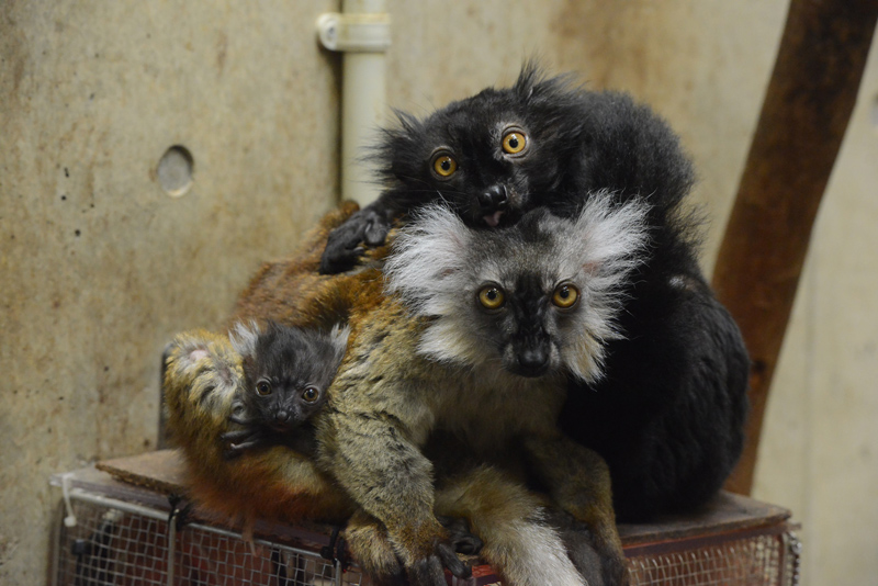西園の「アイアイのすむ森」では、クロキツネザルを飼育しています。クロキツネザルは、アフリカ大陸南東部に位置するマダガスカル島北西部の熱帯低地林や山林に生息するキツネザルのなかまです。雌雄で体の色が異なり、オスは全身が黒色ですが、メスは背中が茶褐色で腹はクリーム色、アゴから耳にかけて白い房毛をもっています(写真1)。
