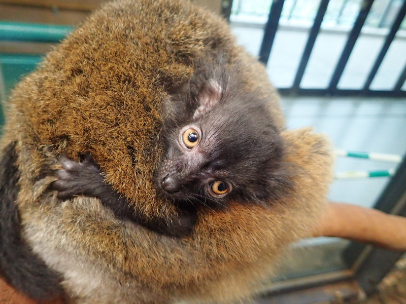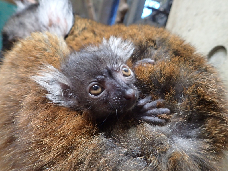 じつは生後しばらくの間は、クロキツネザルの子は雌雄ともに母親と似た茶色っぽい色をしています。生まれてすぐの子どもは、母親の腹に腹巻きのように横向きの姿勢でしがみつくことから、母親の体の色に似ていることで子の存在が目立ちにくくなり、身を守るのに役立つためといわれています。オスは母親の体から離れ始める5~6週ごろまでに黒色に変わります。ただし、耳の房毛の色は生まれたときから雌雄で異なり、メスは白色です。