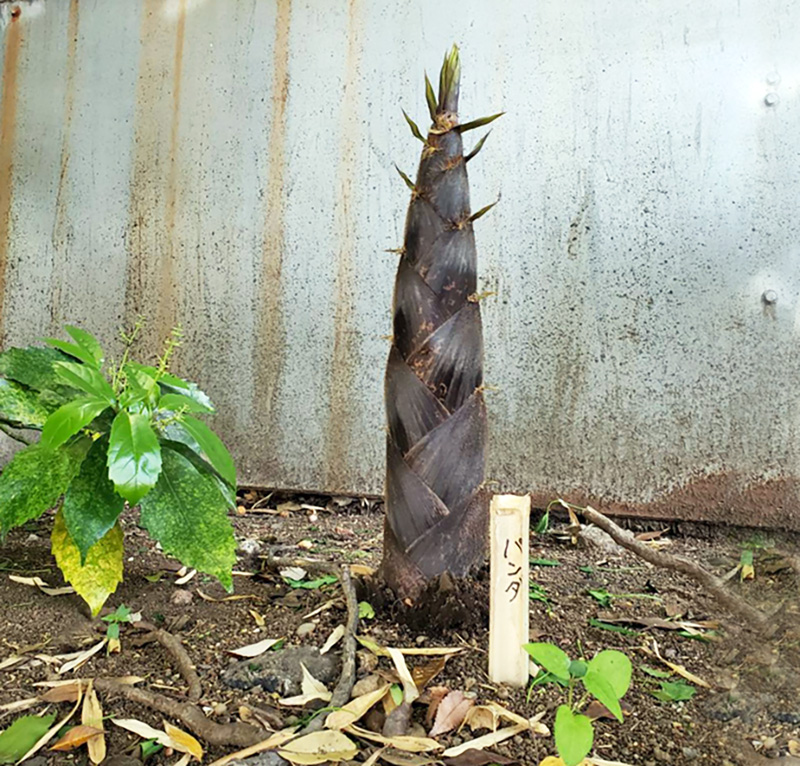 毎年4月ごろになると、園内で生えてくる新鮮なタケノコを手に入れようと飼育担当は目を皿のようにして探し回ります。パンダには私たちが食べているタケノコより大きく成長したものを与えており、たとえ人の背丈ほどに伸びてしまっていても、皮がついている状態であれば大抵は食べてくれます(むしろ可食部が増えるからパンダにとってもうれしい)。