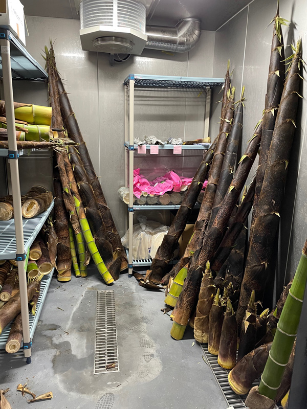 毎年のようにタケノコの入手に頭を悩ませていましたが、園内の植物を知り尽くす施設係の職員のおかげで、今年は例年にないほど多くのタケノコを手に入れることができました。現在冷蔵庫で保存しつつ、パンダたちの毎日のちょっとした楽しみとして与えています。