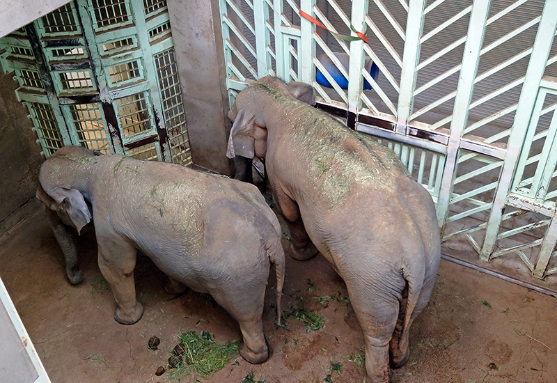 放飼しているあいだ、仕切り越しにスーリヤとウタイが鼻で触りあっていることがあります。そのようすはとても穏やかそうに見え、もしかしたら同居できるのでは……と思いたくなります。しかし、これまでの経緯から考えるとそれは難しいと言わざるをえません。仕切り越しでは互いに過度な干渉なくすごせても、同居となるとうまくいかないのがスーリヤとウタイの関係性のようです。仕切られていれば隣にいても問題ない、という関係がもし悪化してしまうと、それ以降は仕切り越しでの接触すらできなくなってしまう可能性があるため、現在の関係を維持できるよう、当面は同居しない方針で進める予定です。