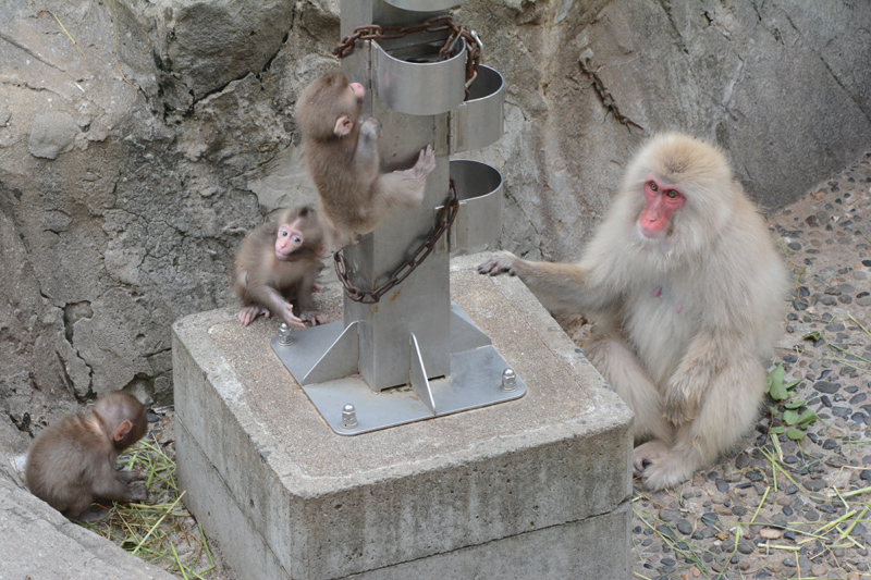 3頭の母ザルはどの個体も初産です。母ザルは産後数日は特に警戒心が強く、子ザルをしっかりと抱え、飼育係にもなかなか子ザルを見せようとはしてくれませんでした。生後1週間くらいして、徐々に母ザルから離れる場面も見られるようになり、1ヵ月もすると、子ザル同士で遊ぶ場面も増えてきました。母ザルはみな初めての子育てということで、好奇心旺盛な子ザルたちに手を焼いているようすもうかがえます。