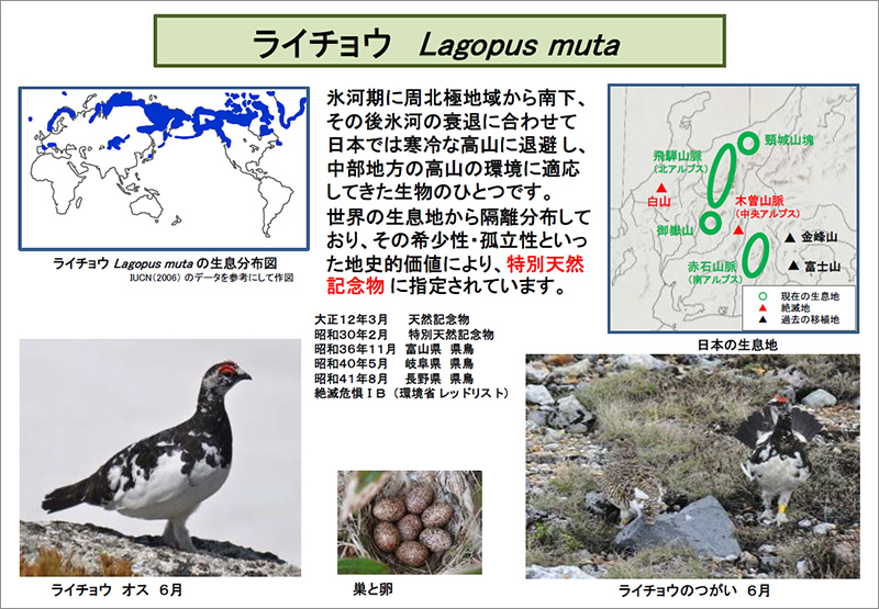 国際生物多様性の日」(1992年5月22日ケニアでの「生物多様性条約」採択に由来)にちなみ、富山県のご協力を得てライチョウ生息地での保護の取組みをご紹介したいと思います。