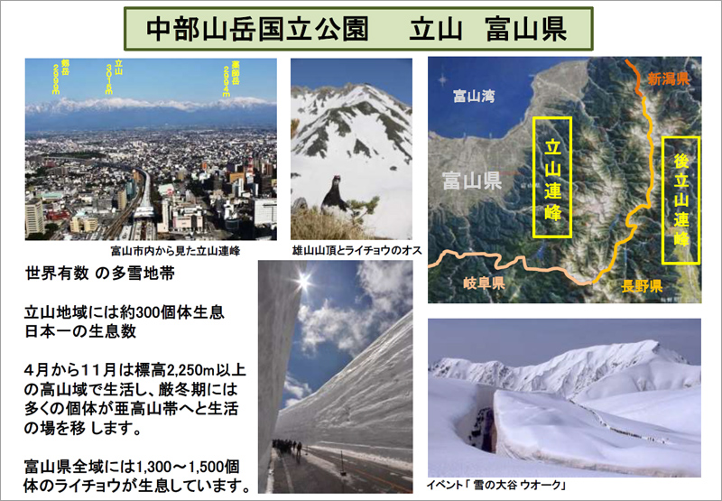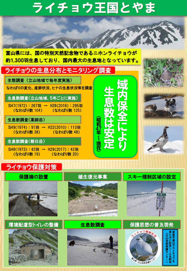 富山県では国内最大の生息地である立山の環境保全に積極的に取り組み、ライチョウの保護と生息環境の維持を図っています。