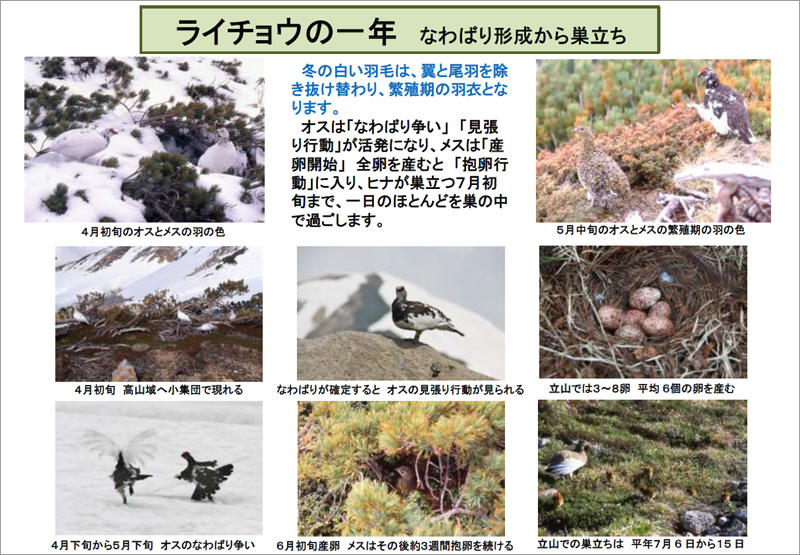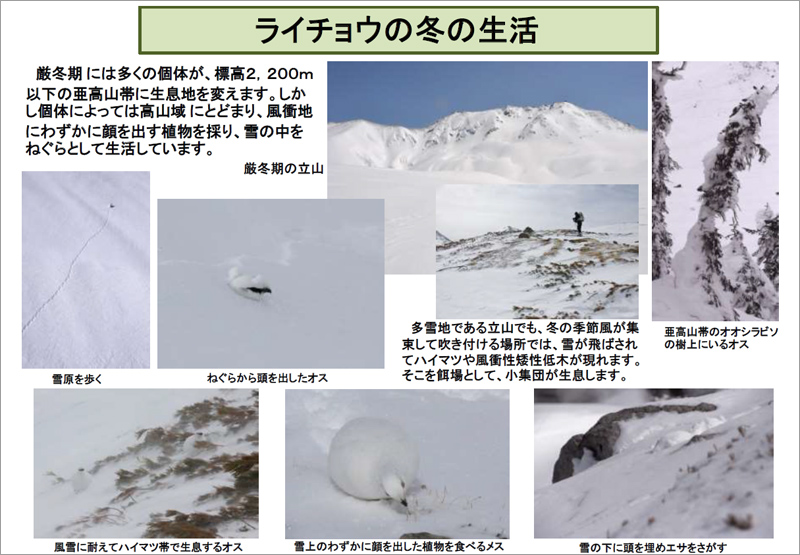 その取組みは多岐にわたります。生息数の調査や、生息環境の植生調査はもちろん、入山者により持ち込まれた病原菌の監視も実施しています。さらに、縄張り、産卵数、孵化率、ひなの生息状況、冬季における生息状況、越冬場所、採餌場所の調査も実施しています。実際に山に入って観察をおこなうことになるので、冬山における調査は山に慣れていないと危険も伴います。厳しい調査を継続して実施しているからこそライチョウに関する多くの知見を収集でき、保全対策にも活用できるのです。