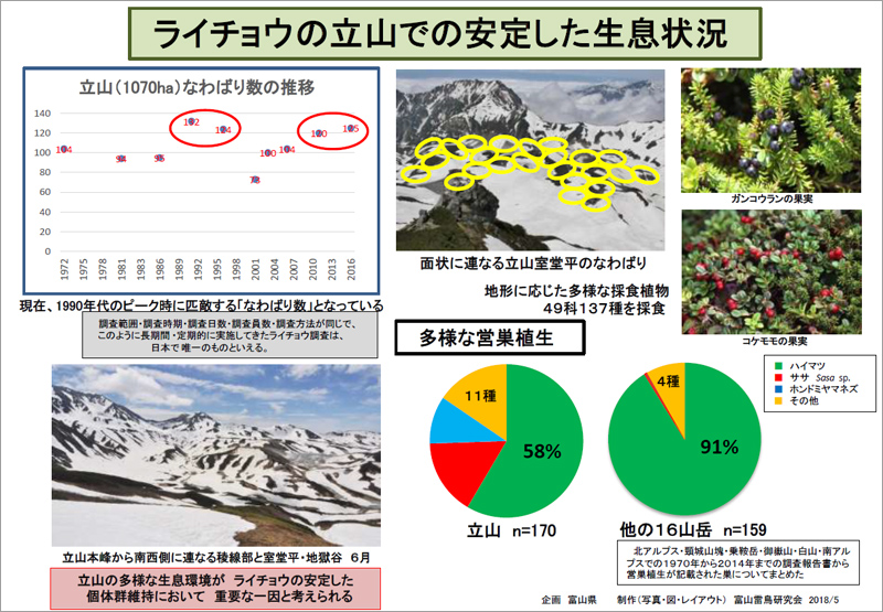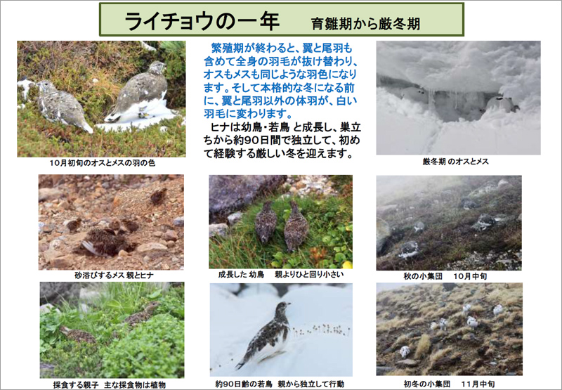 このように、富山県では多面的な保護対策がおこなわれています。生息地で野生個体を見守り続けることはとても大変ですが、継続した取組みのおかげでライチョウの生息数は安定した数を維持できています。