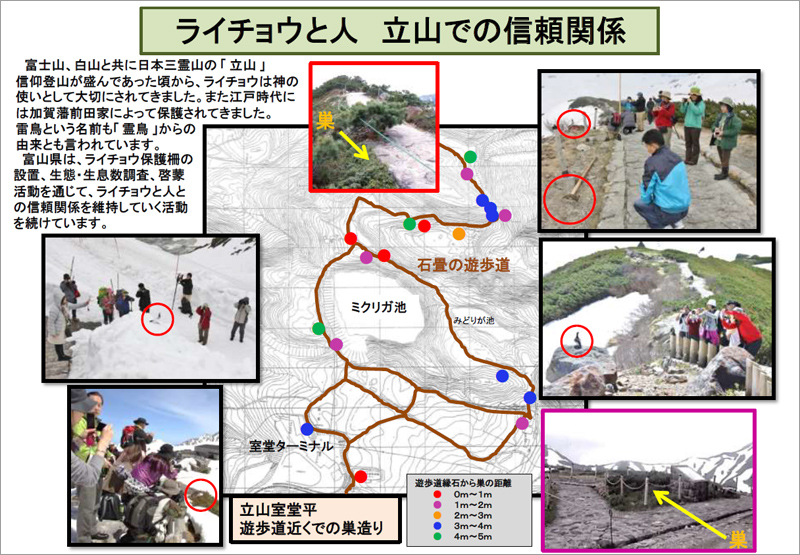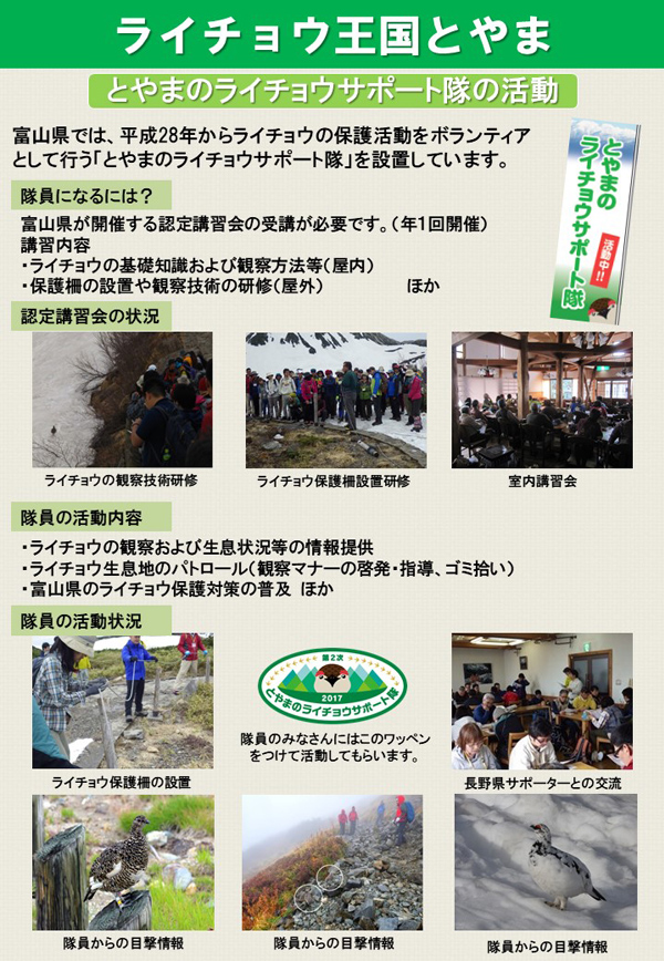 また、富山県では、ライチョウをいっしょに見守るサポーターの育成にも力を入れています。ボランティアでライチョウの保護活動が可能な方向けに講習会を開催し、観察マナーの普及や保護活動への協力を呼び掛けています。さらにライチョウの目撃情報を投稿してもらう仕組みもウェブサイトに設けており、情報の集積もしっかりおこなっています。
