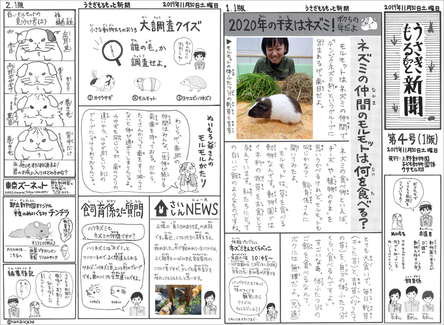 上野動物園の子ども動物園では、動物とふれあえる体験プログラムをおこなっています。そこで活躍するウサギやモルモットがくらしているのが「すてっぷ館」にある「小さな動物たちのおうち」。ここでくらす動物や飼育係の仕事についてお伝えするために、今年(2019年)に「うさぎ・もるもっと新聞」(通称:うさもる新聞)を創刊しました(創刊のお知らせ)。