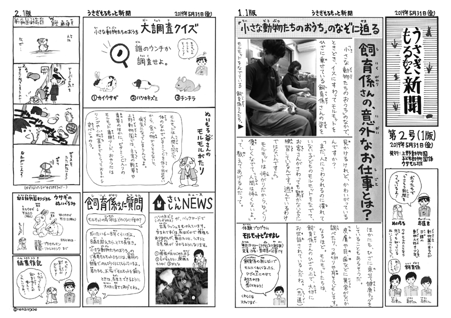 このたび第2号が完成! 第2号の特集は、モルモット担当飼育係ならではの仕事のなぞに迫りました。ほかにも、出産ラッシュのパンダマウスの近況など、もりだくさんの内容です。