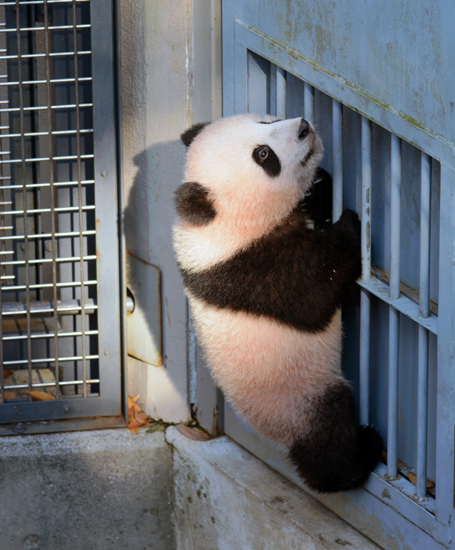 シャンシャンは1〜3時間起きては3〜4時間眠るという日々です。起きているときは室内を歩き回ったり、木やドアの格子に登ったり。眠るときは室内の片隅で横になってじっと休んでいます。